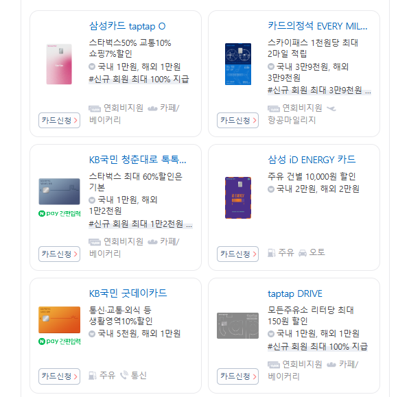 - 포인트 적립 및 할인 혜택: 신용카드에 따라 다양한 혜택 제공